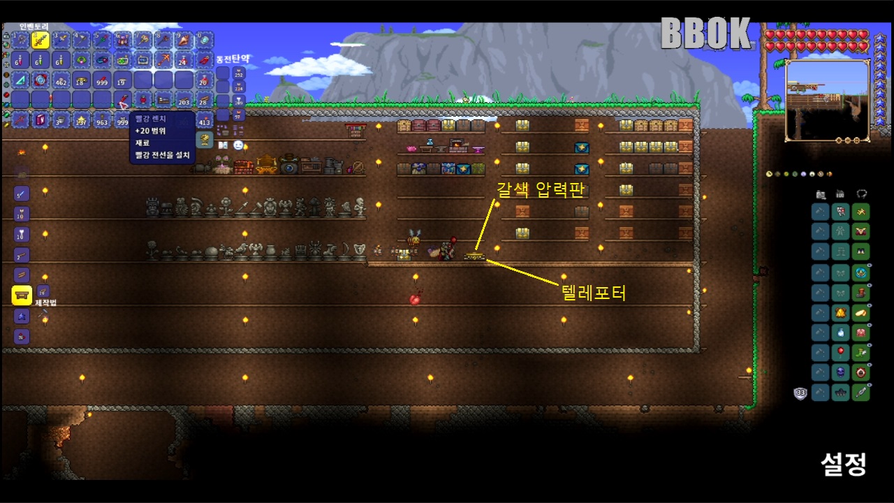 왼쪽 끝에 "텔레포터", "갈색 압력판"을 설치하고 선을 연결합니다.