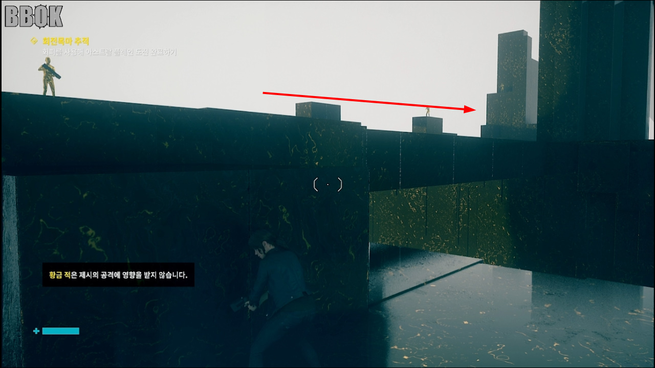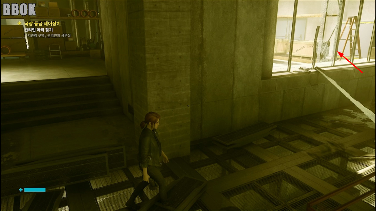 화살표 방향의 유리를 근접 공격으로 부수고 들어 갑니다.