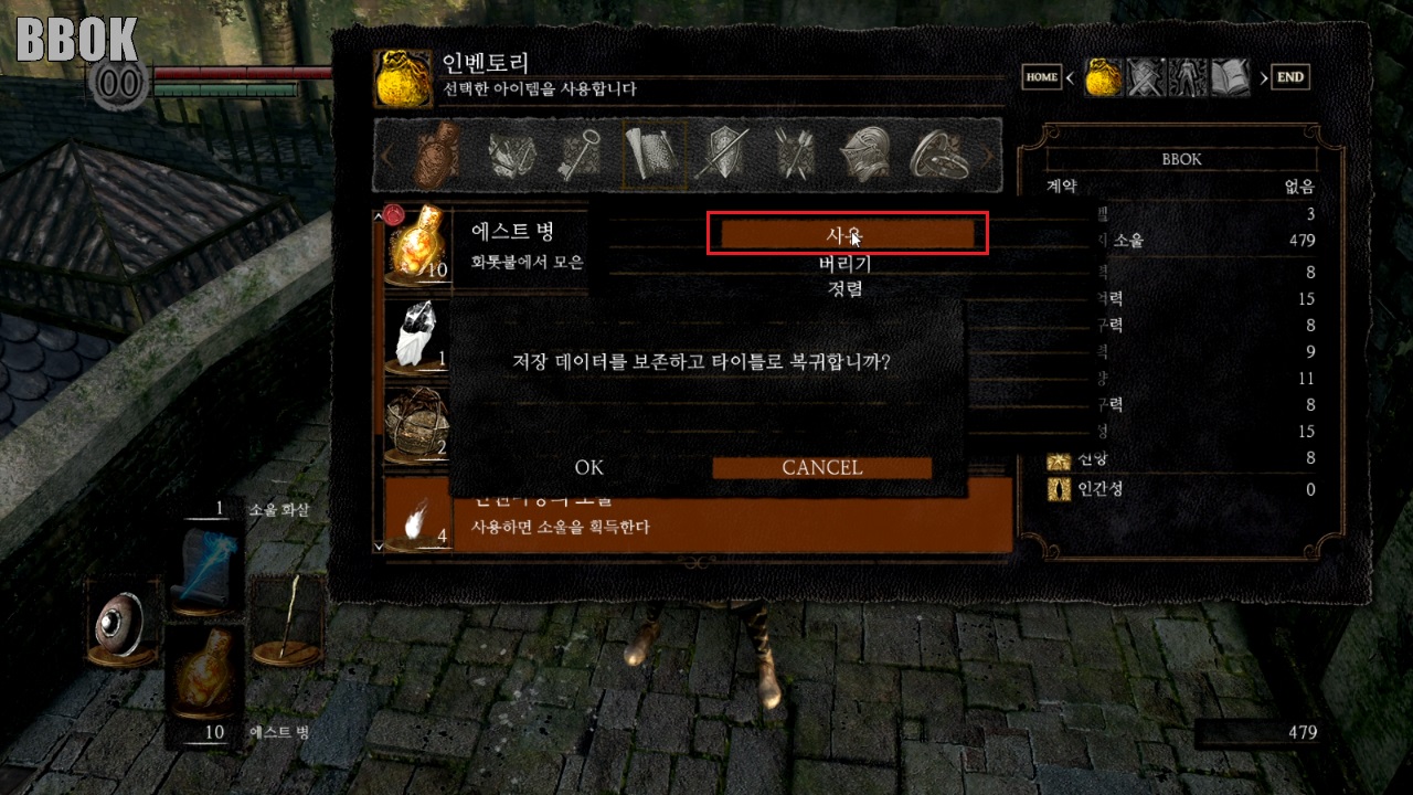 현재 뒤에 보이는 아이템 창은 사용하기에 가 있습니다.