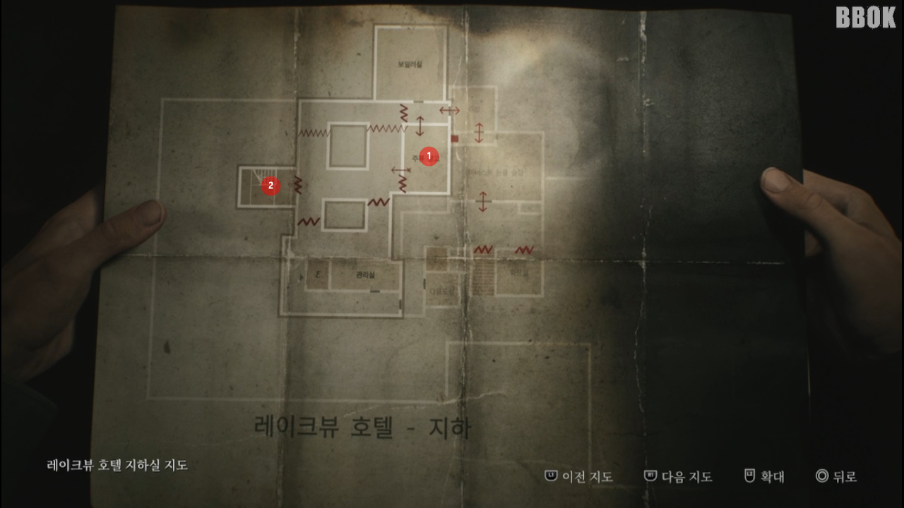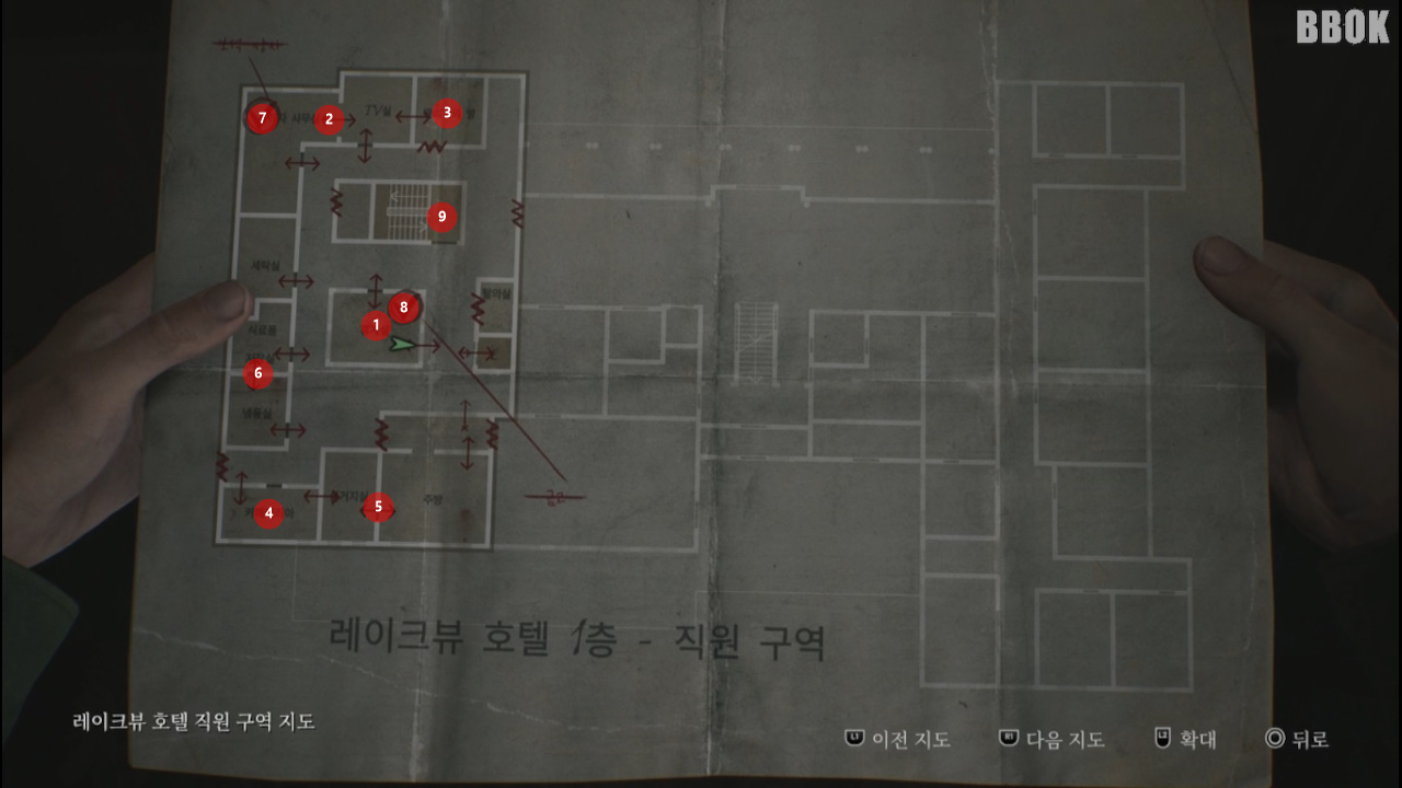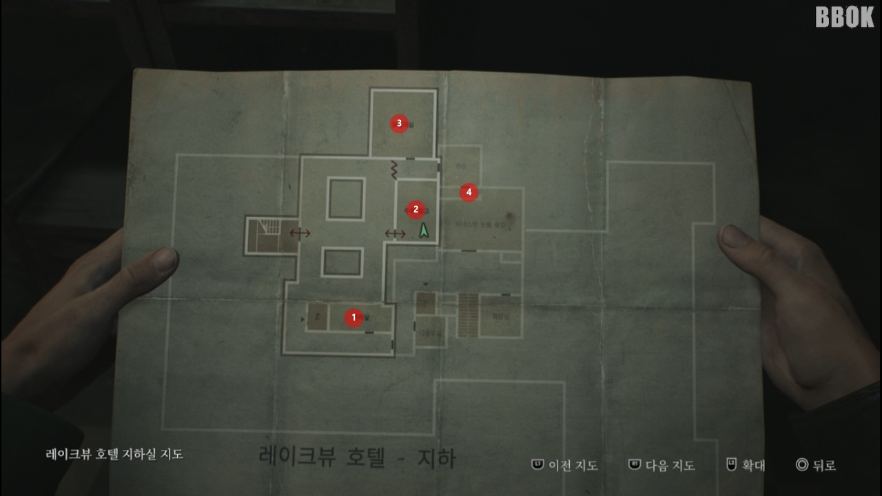 08. 휴게실 금고에 비밀 번호를 사용해서 비디오테이프, 지하실 열쇠를 얻습니다. 09. 비상구 적들을 피해서 비상구 문을 열고 내려가면 됩니다.