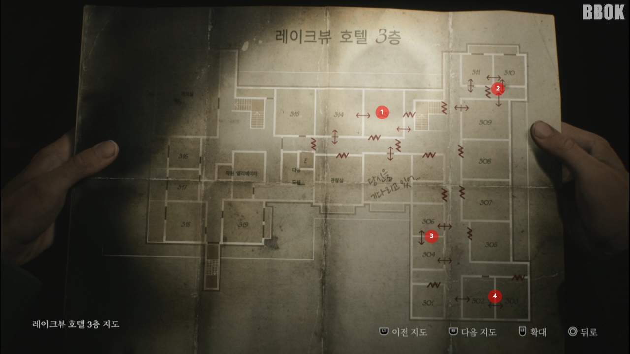 (310, 309호)가는 길에 권총 탄약이 있고 311호 화장실에 있는 부서진 벽으로 가서 309호로 갑니다.