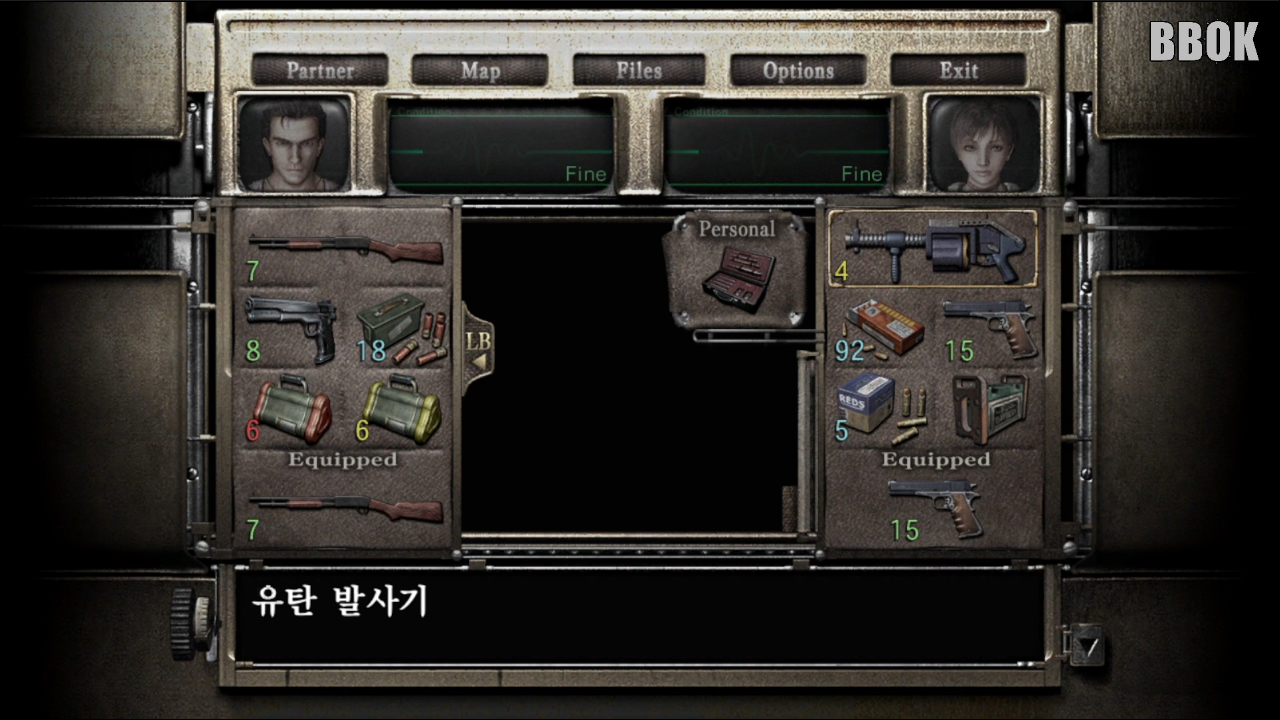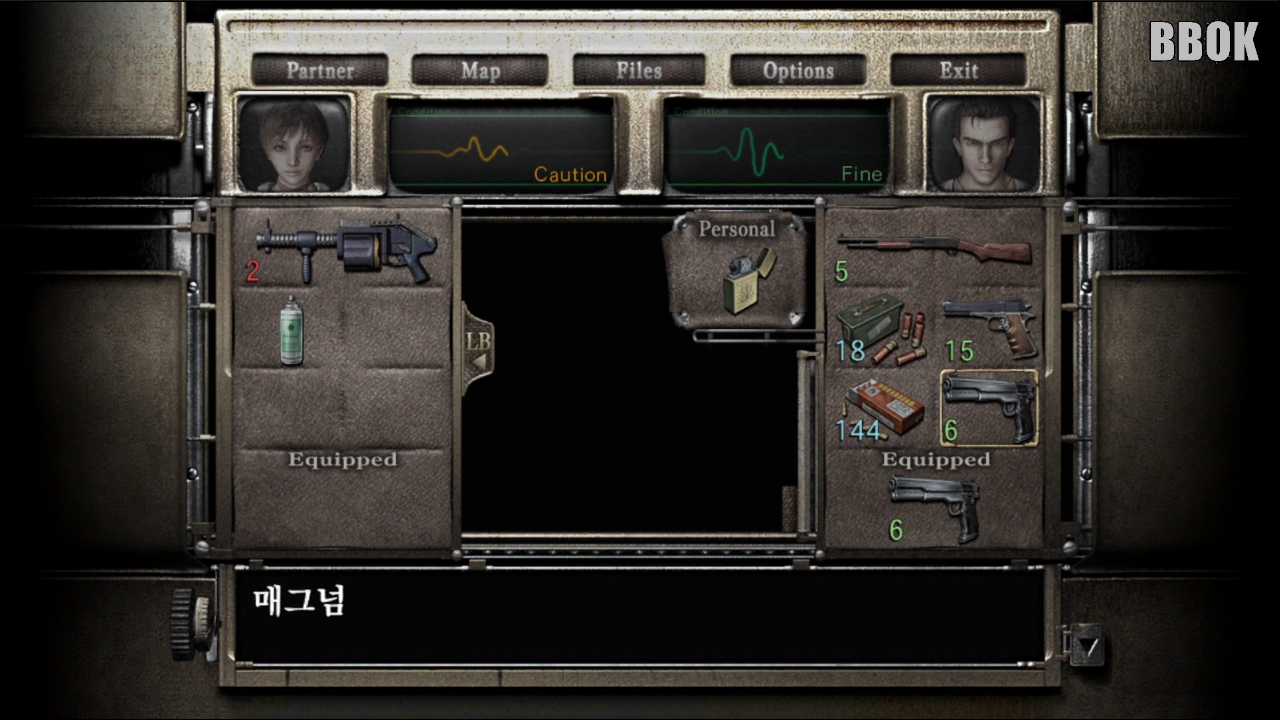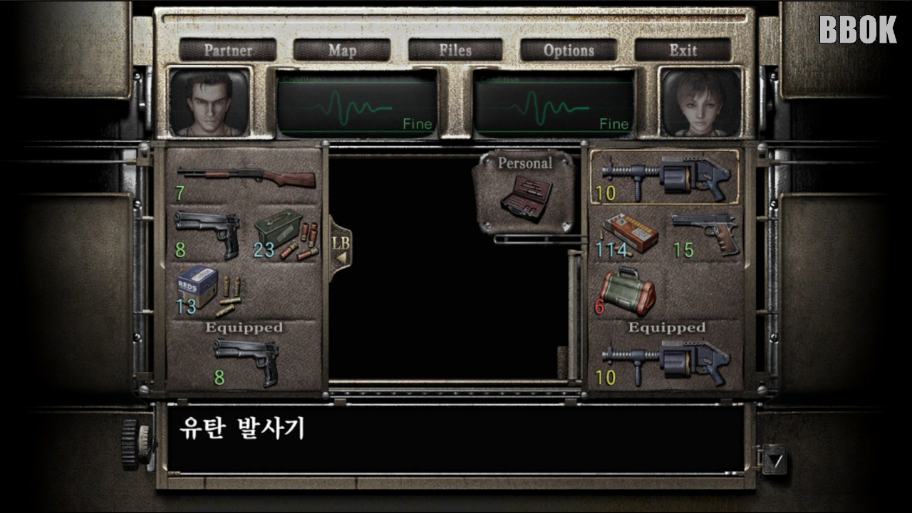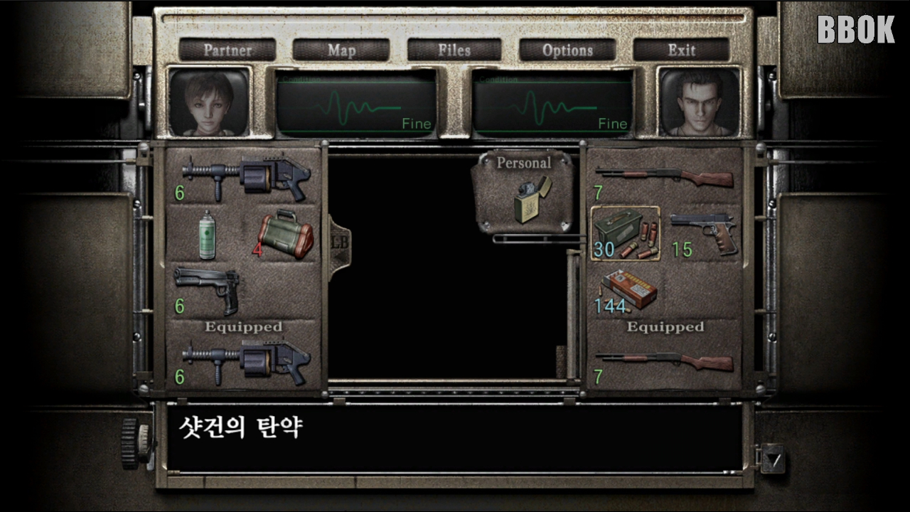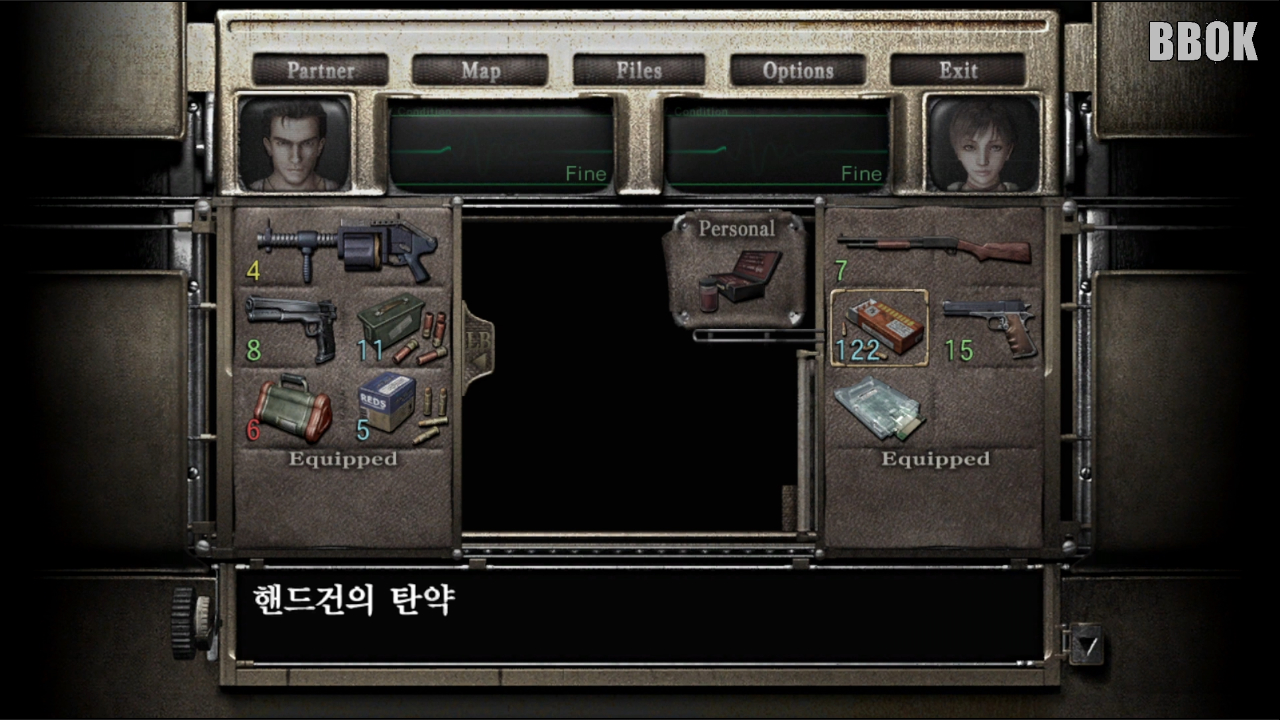 다음 방에 가면 "화염탄", "권총 탄약"과 회복 약과 파일이 있습니다.