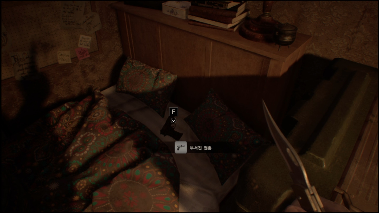 침대에 "부서진 권총"도 있으니 주워서 정리합니다.